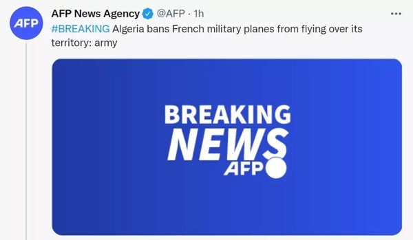 据法新社刚刚报道,法国军方表示,阿尔及利亚政府已禁止法国军机进入该国领空。法新社称,发生这一事件的背景是,“签证纠纷”在法国与阿尔及利亚之间引发外交危机,以及法国总统马克龙发表批评阿尔及利亚的言论。