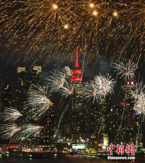 2018年,中国驻纽约总领事馆前的哈德逊河上空燃放起焰火,庆祝中国狗年春节。