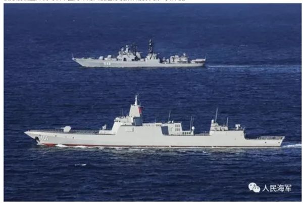 图为南昌舰和俄罗斯大型反潜舰在联合机动。