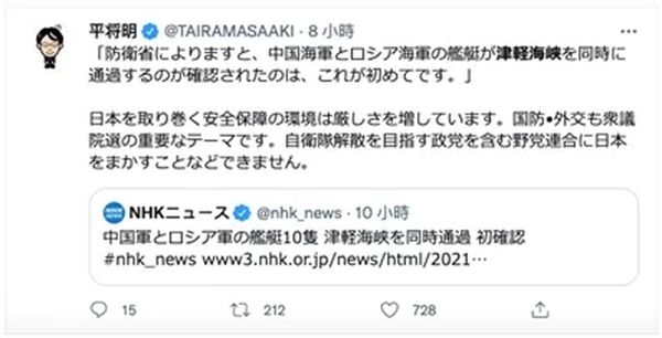 稍微实际一点的,就是跟今天开始的众议院选举扯上关系。日本自民党国会众议员平将明说:“日本周边的安全保障环境日益严峻,国防外交也是众议院选举的重要议题,绝对不能将日本交给在野党联盟,他们里面有包括企图解散自卫队的政党。”