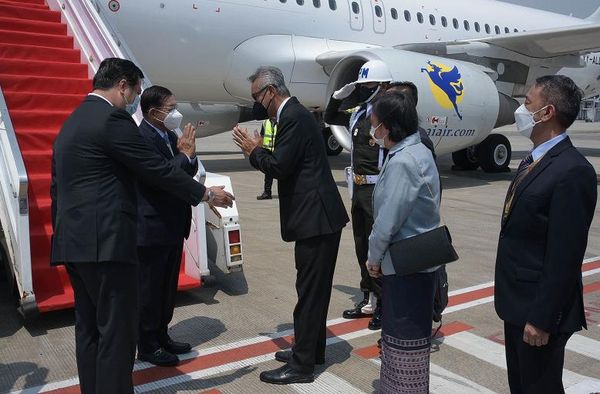 △缅甸国家管理委员会主席敏昂莱(左二)于4月24日抵达印尼首都雅加达参加东盟领导人缅甸问题特别会议