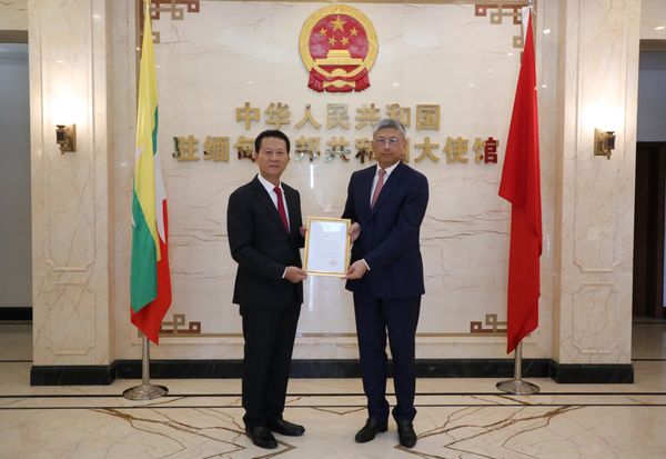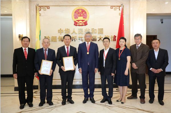 会见后,陈海大使向中华总商会、缅华各界抗疫委员会颁发了表彰函,林文猛会长代表侨界向陈海大使等使馆人员颁发了抗疫纪念章。
