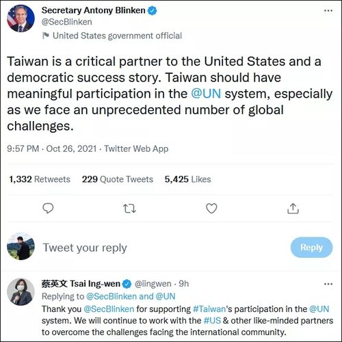 10月26日,布林肯先通过国务院官网发布声明公然挑衅,后又在推特上与蔡英文高调互动炒作涉台问题