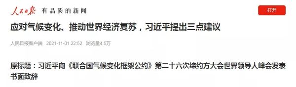 11月1日,国家主席习近平向《联合国气候变化框架公约》第二十六次缔约方大会世界领导人峰会发表书面致辞。