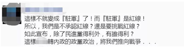 而对于台媒又爆出“美军‘特战合作’将成‘常驻台湾协训编制’”,有岛内网友说:这样不就变成“驻军”了!而“驻军”是红线!所以,我们是不承认红线?还是要挑战红线?如此宣布,除了民进党得利外,有谁得利?该网友担心,这样的政党政治,会“将我们推向战争”。↓