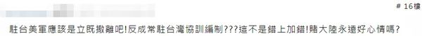 还有网友说:“在台美军应该是立即撤离吧!反成常驻台湾协训编制???这不是错上加错!赌大陆永远好心情吗? ”↓