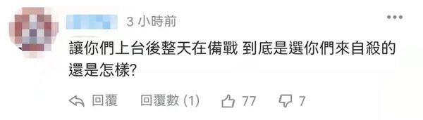 “问题是台湾根本没人想战争!要怎么打?”“整天在备战,到底是选你们来自杀的还是怎样?”
