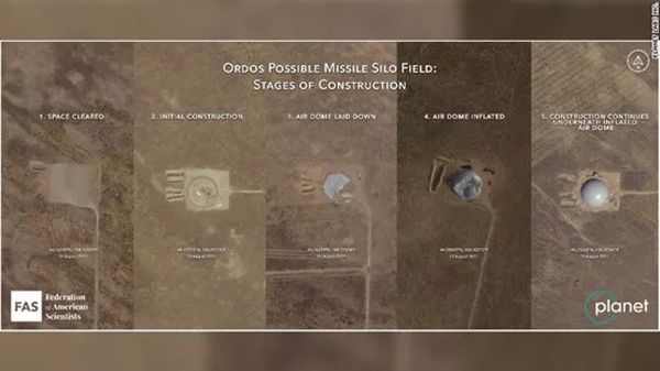 美国有线电视新闻网的报道称,“美国科学家联合会”的专家通过对美国商业遥感卫星影像公司 Maxar和 “星球实验室”提供的商业卫星图像进行分析,发现“中国在内蒙古鄂尔多斯地区新建的多个导弹发射井已陆续进入不同的施工阶段”,其中有三口导弹发射井建设“神速”,已经“使用圆形的充气保护罩以保护发射井上建筑”,“美国科学家联合会”在报告中称,在上世纪70 年代和80 年代,中国就曾混合使用“大矩形罩”、“伪装网”和其他类型的遮蔽装置来保护导弹发射井免受恶劣天气的影响和间谍卫星的侵扰。
