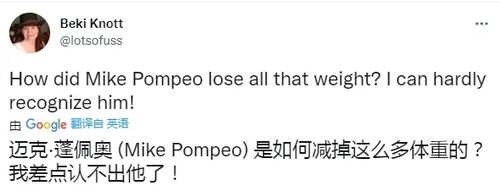 最近网友看到蓬佩奥的照片和采访视频,纷纷表示不敢认,这还是当年的“蓬胖”吗?!