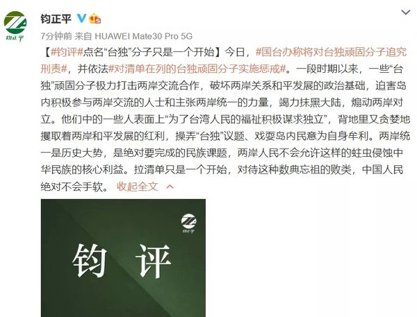 此前报道:国台办:大陆将依法对“台独”顽固分子追究刑责,终身有效!