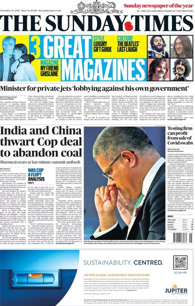 英国《星期日泰晤士报》则在其头版头条上写道:印度和中国阻挠了联合国终止使用煤炭的公约。