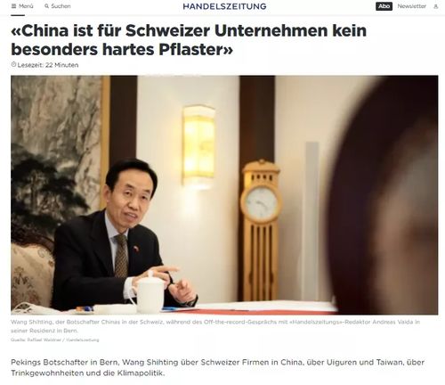据中国驻瑞士使馆网站11月19日消息,11月17日,瑞士《商报》网络版全文刊发对王世廷大使的专访。王大使就中瑞双边关系,中瑞自贸协定和经贸合作、“一带一路”合作,中国低碳减排措施以及中国国内最新发展等问题回答了记者提问,并就涉疆问题、台湾问题和所谓“中国间谍”、“网络攻击”等谣言谬论进行了批驳。