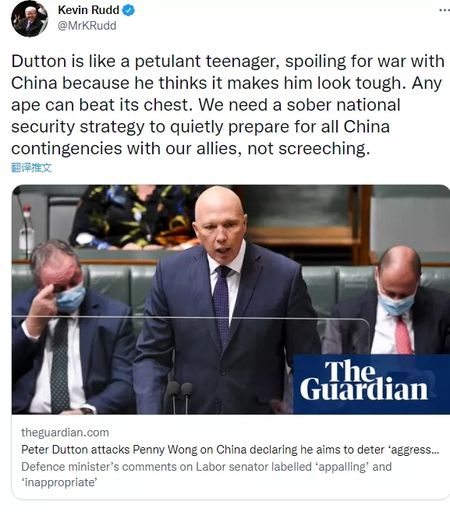 澳大利亚前总理陆克文24日在推特上转评《卫报》这篇报道称,“达顿就像一个暴躁少年,热衷于与中国开战,因为他认为这让他看起来很强硬。任何猿类都会捶胸。(但)我们需要一个清醒的国家安全战略,让我们与盟友一起,为应对与中国相关的突发情况做准备,而不是只尖叫”。↓