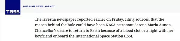 塔斯社的文章一出,美国方面迅速做出反驳,NASA还多次公开表态支持瑟琳娜,“我们坚决相信她的专业能力。”但俄罗斯联邦航天局一直没有放弃对真相的调查,最近他们通过媒体明确表示,2018年的这起漏气事件就是瑟琳娜所为。