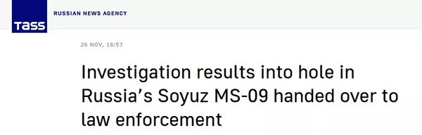2018年8月,负责运送宇航员和物资的俄罗斯联盟号飞船Soyuz MS-09被监测到“漏气”,宇航员在舱壁上竟发现了一个贯穿的小洞。