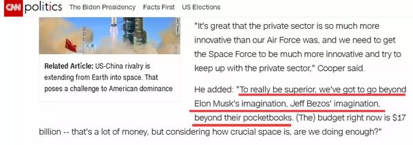 在CNN的报道中,一名大力支持发展美国太空军的美国国会议员就直白地表示,美国太空军的技术和财力甚至还不如美国相关领域私企。该政客表示,美国太空军如果想成为真正的强者,就需要拥有“超越埃隆·马斯克与杰夫·贝索斯”的想象力和财力。埃隆·马斯克与杰夫·贝索斯都是美国知名的高科技企业家,并且近些年都在着力于发展太空科技。