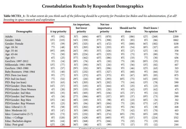 该民调还显示,对美国太空技术的投入,其实仅排在美国民众关心的26项议题中的倒数第二位。他们更关心的还是社会福利、医保、以及贫富差距和种族主义问题等目前困扰美国社会的重大民生议题。(如下图所示)