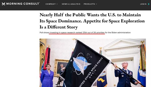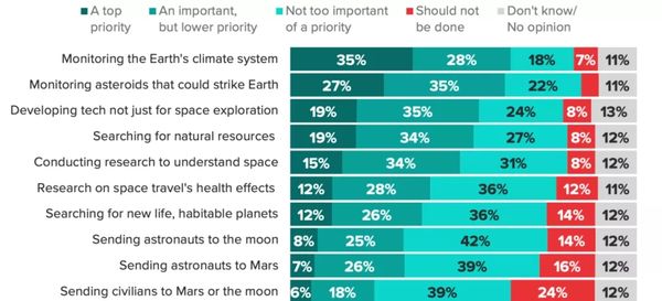 而今年2月来自美国民调机构Morning Consult的又一项民调显示,美国人虽然支持美国保持在太空技术上的领先,但那只是为了更好的研究和观测地球,比如观测地球的天气变化和预防陨石对地球的撞击。