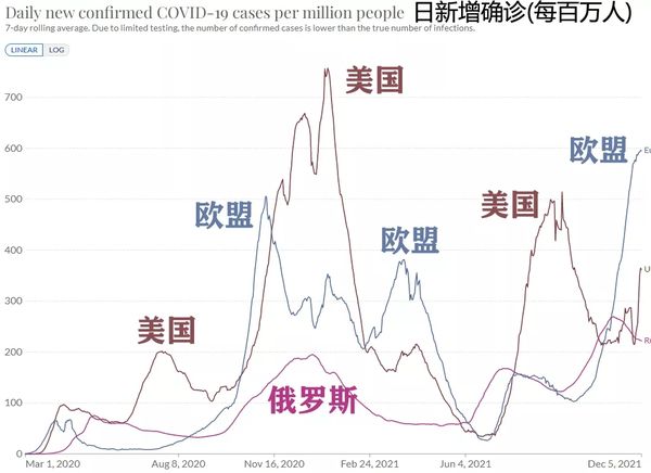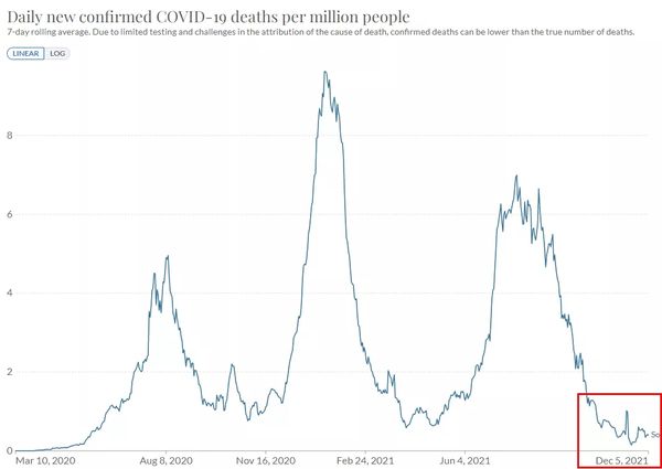 在过去7天里,美国平均每天新增确诊12万人,每天有近1300人死亡(流行的主要还是D株)。这还远不是最坏的情况(去年顶峰每天4000人)。