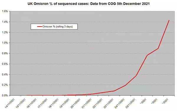 但以全球基因测序上传比例最高的英国来看,Omicron的增长的确很快,占比每3天翻一倍。