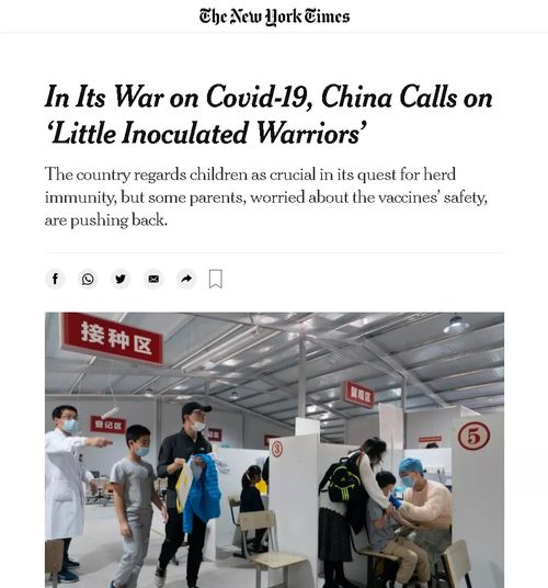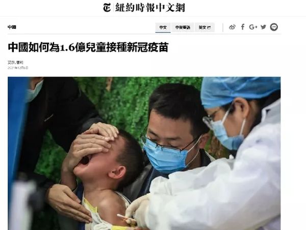 下图,便是《纽约时报》在报道中国给少年儿童接种疫苗时,使用的那张引起了包括许多美国人在内的外国网民强烈反感的图片。