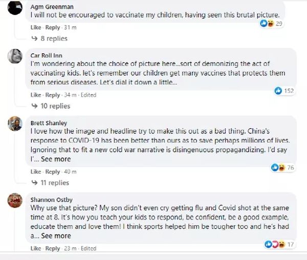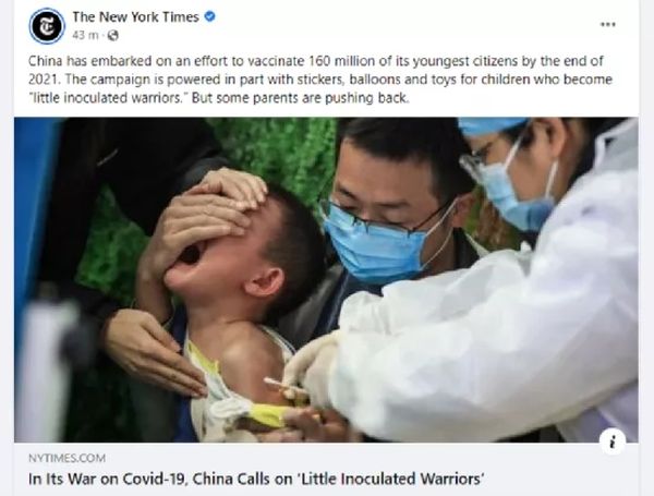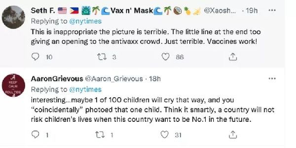 其中,在“脸谱网”上,不少外国网民就表示这样的图片只会打消他们给孩子打疫苗的念头。有人则直接斥责起了《纽约时报》的图片选择,称这样的图片是在妖魔化儿童的疫苗接种工作,这必然会给许多国家的疫苗接种带来巨大的困扰。有人更表示《纽约时报》的这种做法就是为了抹黑中国,给美国等防疫失败的西方国家转移矛盾。