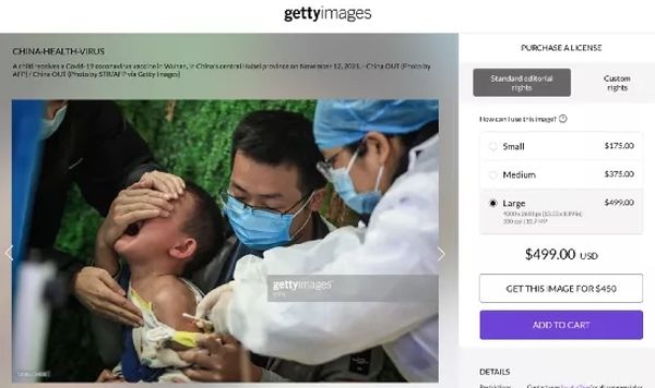 首先,我们通过检索发现,这张被西方媒体用来抹黑中国的儿童疫苗接种工作、并煽动反疫苗情绪的图片,正在国外的图片库Getty Images上以499美元的价格售卖。图片的来源是一名疑似与法新社有合同关系的摄影者,于2021年11月12日在武汉中心医院拍摄的。