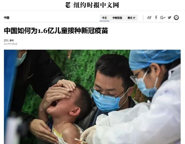 这样的一张颇具“视觉冲击力”的图片,再配上《纽约时报》在这篇报道的正文部分对中国疫苗接种工作“阴阳怪气”的描写——尤其是该报将一些中国家长不愿意给孩子打疫苗的情况与中国相对严格的新冠防控措施和疫苗接种政策刻意“对立”起来、进行种种“挑拨”的操作,一个“强权逼迫少年儿童打疫苗”的“可怕”形象,便“跃然纸上”了。