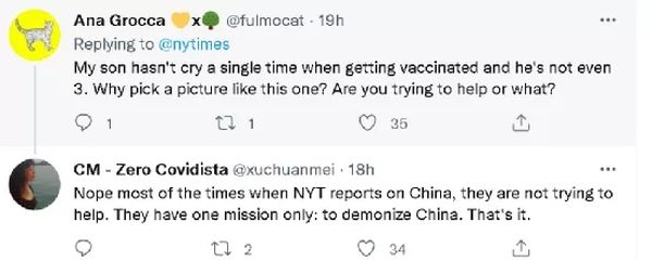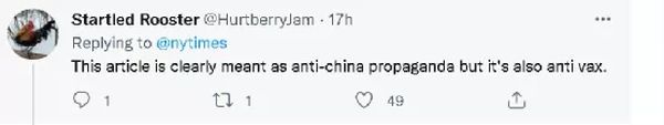 在“推特”上,包括不少美国人在内的诸多外国网民,也同样吐槽《纽约时报》的配图,有的认为《纽约时报》的编辑记者“没品味”;有的认为《纽约时报》的配图是在打消人们打疫苗的积极性,给全世界的疫苗接种工作添乱;还有的人亦表示这家美国媒体就是故意选的这张图,为的就是要抹黑中国。