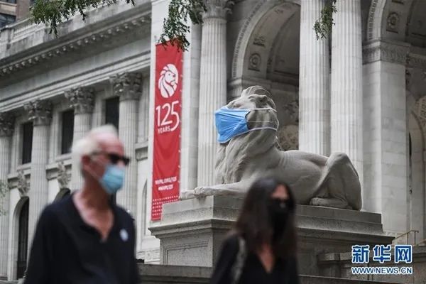 在美国纽约公共图书馆前拍摄的“戴”口罩的石狮子。新华社记者 王迎 摄