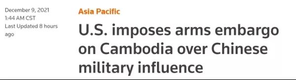 据路透社报道,美国当地时间8日对柬埔寨实施武器禁运和新的出口限制,理由是美方所称的“中国对柬埔寨日益增强的军事影响力”以及柬埔寨国内存在所谓“人权”和“腐败”问题。