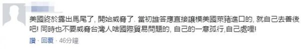 还有人称,“美国终于露出马尾了,开始威胁了,当初谁答应直接让美国莱猪进口的,就自己去善后吧!同时也不要威胁台湾人啥国际贸易问题的,自己的一意孤行,自己处理!”