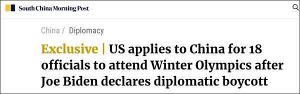 《南华早报》援引两名消息人士及一份文件称,美国政府近期向中国提交了一份为期三个月的签证申请,名单上的18名美国官员中,15人为美国国务院工作,1人为五角大楼工作。他们计划参加北京冬奥会,提供所谓“安全支援行动”。