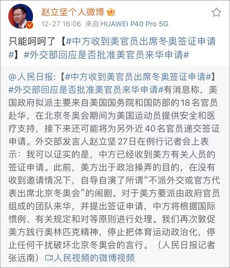 外交部证实:收到美方官员冬奥来华申请。@赵立坚个人微博 :只能呵呵了。