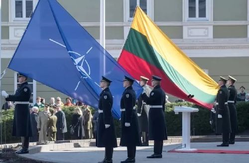 ▎在立陶宛首都维尔纽斯,士兵们准备升起北约旗帜和立陶宛国旗 图源:新华社