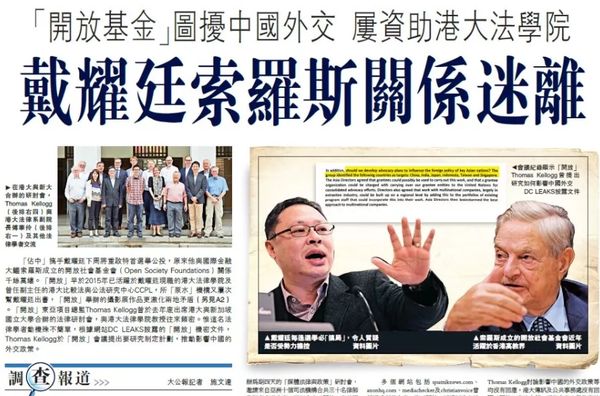 2017年,香港大公报发文起底戴耀廷与索罗斯基金会的关系。图自大公报