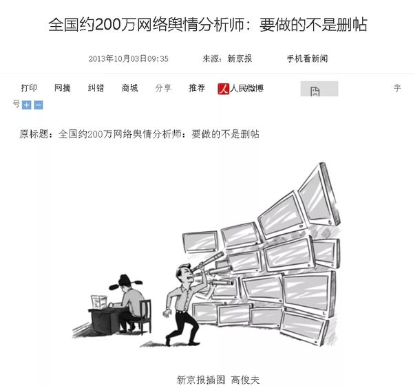 不仅如此,如下图所示,当时《新京报》在报道里还阐明了两个相当重要的信息:1、这200万网络舆情分析师既有为党政宣传部门工作的、也有为门户网站或商业公司工作的,而不是《华盛顿邮报》所渲染的都在给中国政府工作;2、那些给政府工作的网络舆情分析师,要做的“不是删帖”,而是考察和反映网络民意,以助力政府科学决策。