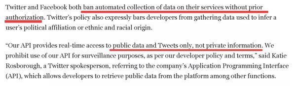 这一点上,其实Cadell在她的报道中自己“说漏”了。如下图所示,尽管她宣称推特和脸谱网等境外社交网络都禁止“自动收割用户数据”,但一名她所引用的推特站方的发言人却表示推特禁止获取的是私人信息,而推文等任何人都可以看到、搜集和整理的信息则是公开的。