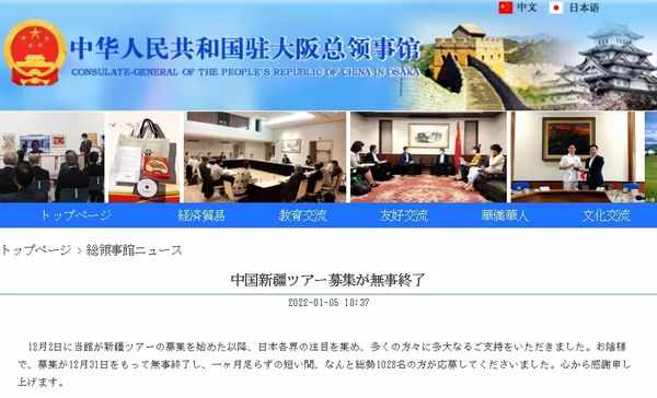 在各方支持与帮助下,招募工作于2021年12月31日顺利完成。大阪领事馆总领事薛剑5日对《环球时报》记者表示,在不足一个月的时间内,日本国内共有1028人报名,彰显出日本民众对新疆之行的极大兴趣和热切期待。