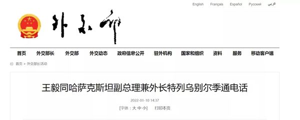 2022年1月10日,国务委员兼外长王毅同哈萨克斯坦副总理兼外长特列乌别尔季通电话。