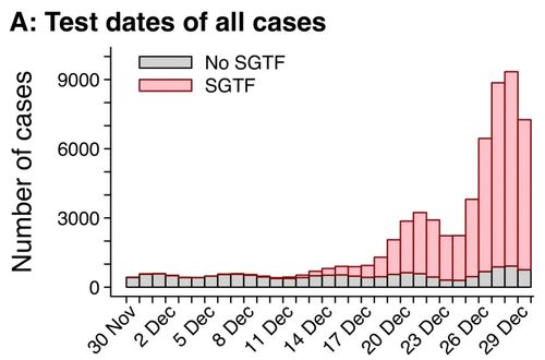 而在此基础上,12月中开始Omicron感染(上图红色)出现,并随即在12月下旬的短短10天内暴增。