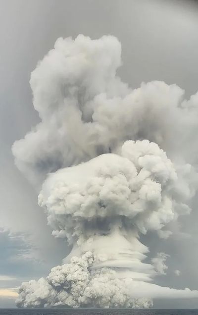 随着一声巨响,汤加火山从海底喷出的气体、烟雾和灰烬像核爆蘑菇云一样从蓝色的太平洋海域升起,直冲天际。汤加首都努库阿洛法距离火山约65公里,居民们听到巨响后,一边尖叫一边四处逃生。火山喷发引发海啸,袭击了汤加沿海。社交媒体上的视频显示,海水涌入一些房屋,人们纷纷向高地逃生。汤加气象局表示,汤加全境面临海啸、暴雨、洪水和强风的危险。有汤加民众形容称,“我们的家在摇动,之后海浪来了。我的弟弟还以为附近发生炸弹爆炸”。