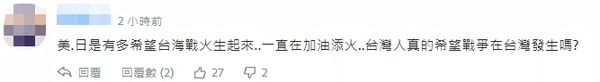 与绿媒的兴奋炒作不同,一些岛内网友认为,“美日是有多希望台海战火生起来…一直在加油添火…”这名网友还反问:台湾人真的希望战争在台湾发生吗?