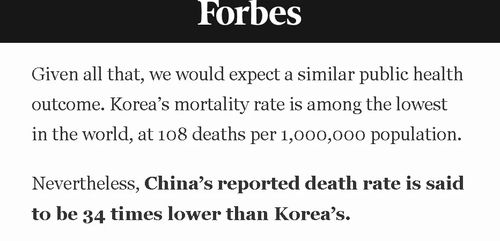 比如,在其中一篇文章中,他一边称中国有大量的农村人口、医疗水平很低,而与中国这种情况相似的那些发展中邻国都在疫情中死了很多人,所以中国不可能只死了这么少的人;一边他又拿出韩国说事,称韩国的防疫政策和中国相似,而且韩国还是发达国家,可中国的死亡率却比韩国低很多很多倍,这不合理。