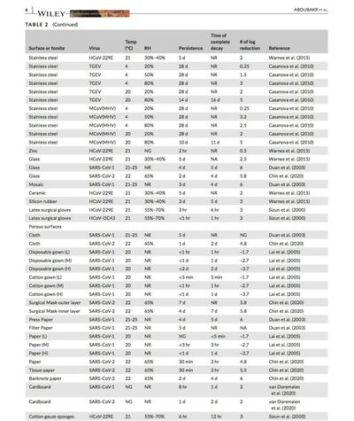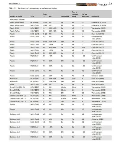 (Aboubakr, H.A. , Sharafeldin, T. A. , & Goyal, S. M. . (2020). Stability of sars-cov-2and other coronaviruses in the environment and on common touch surfaces and theinfluence of climatic conditions: a review. Transboundary and EmergingDiseases.)