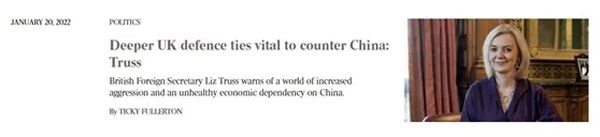 “侵略”,是的,你没看错。已经身在堪培拉的英国外交大臣特拉斯,在接受《澳大利亚人报》专访时毫无掩饰地这样攻击中国。