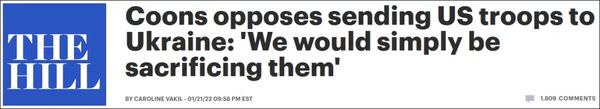 据美媒《国会山报》报道,特拉华州的民主党籍联邦参议员克里斯·库恩斯(Chris Coons)在当地时间1月23日将要播出的一段采访中表示,如果俄罗斯“入侵”乌克兰,他不支持美国派遣军队进入乌克兰,并称此举“只会牺牲他们(美军士兵)”。