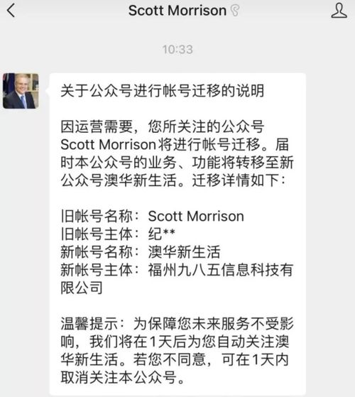 对此,耿直哥在进行了一番检索后发现,有关注莫里森那个微信账号的华人网民,曾在本月初贴出过一张微信站方发给莫里森账号关注者的通知(如下图所示),其内容是莫里森的微信账号因为“账号主体”变更,其账号的相关数据、功能和信息将被“迁移”给新的“账号主体”。