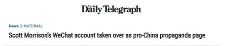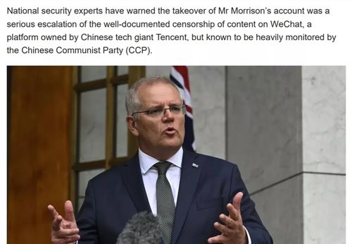 在一篇题为“斯科特·莫里森的微信账号被收缴,成了亲中政治宣传页面”的报道中,该报宣称莫里森在中国微信平台上曾经有一个有7.6万粉丝的账号,用来发布莫里森的相关活动与讲话内容,并与使用微信的澳大利亚的华人民众进行互动。但在本月初,他的这个账号突然被更名为了一个“给澳大利亚华人提供生活资讯”的账号,名为“澳华新生活”。可莫里森的政府却并未收到任何关于此事的通知。