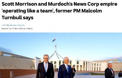 (图为去年其他澳大利亚媒体对莫里森和默多克关系的报道,称莫里森和默多克的“新闻集团”关系紧密,仿佛是“一个团队”的)